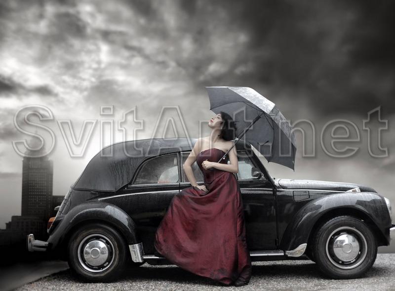 Canvas Woman with a black umbrella, black machine, red dress