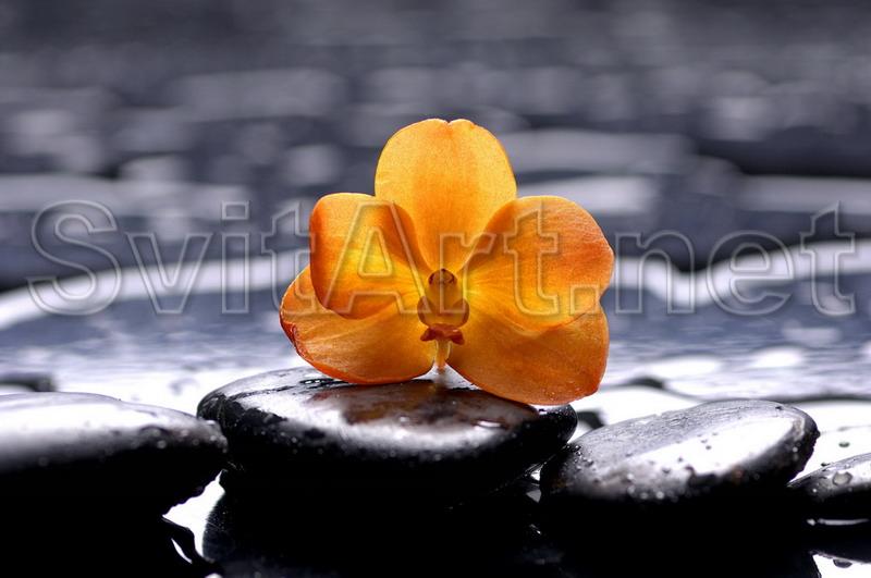 Canvas Orange orchid and black stones, orchid flower on a background of stones, orange flower