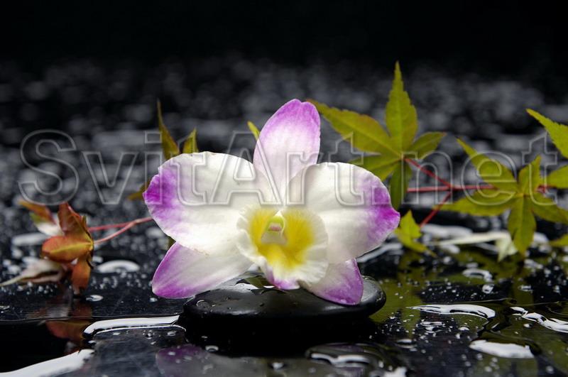 Canvas Pink orchid near water, greens and flower, white orchid on a black background