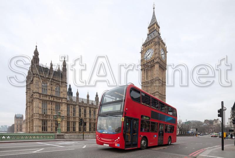 Canvas frameless "Big Ben, London." The famous Big Ben and the British double-decker bus.