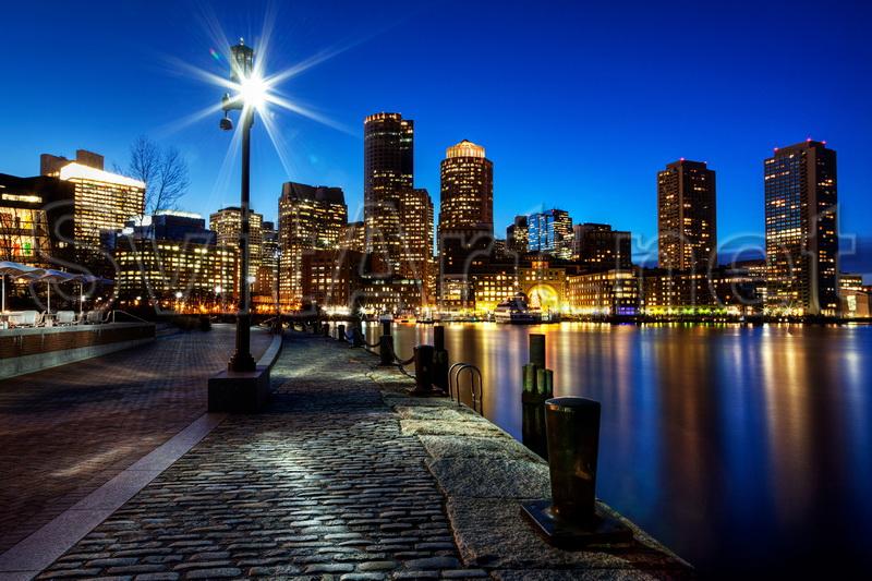 Canvas frameless "Night city". Bright lights of the city in the night, a lantern near the water.