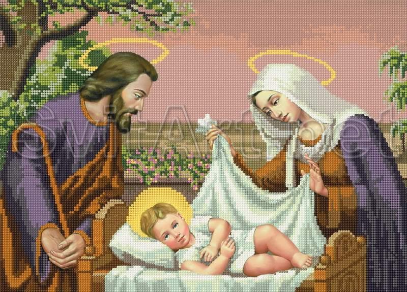 Scheme for embroidery with beads on gabardine and satin: Joseph and Mary near Jesus, Mary hides Jesus, little Jesus. Religion - Joseph and Mary with Jesus