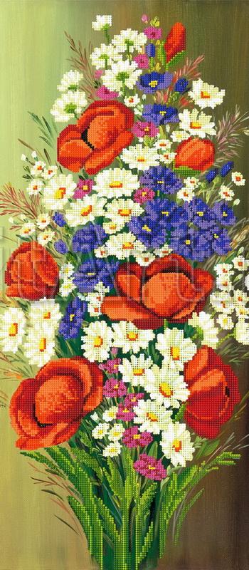 Scheme for embroidery with beads on gabardine and satin: Fresh bouquet with sunflowers lilac and daisies, a beautiful still-life from wildflowers. Flowers, still lifes - poppies