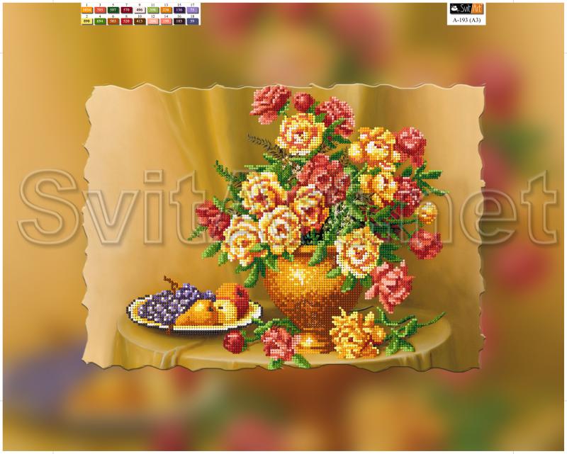 Magnet for embroidery with beads on canvas "Red and yellow flowers in a vase". Flowers in a golden vase on a table next to a plate of fruit.