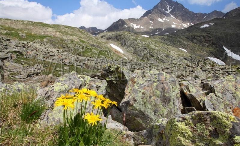 Canvas frameless "Mountain valley". Landscape Yellow flowers on a background of stony mountain valley with grass. In the distance, beautiful mountains.