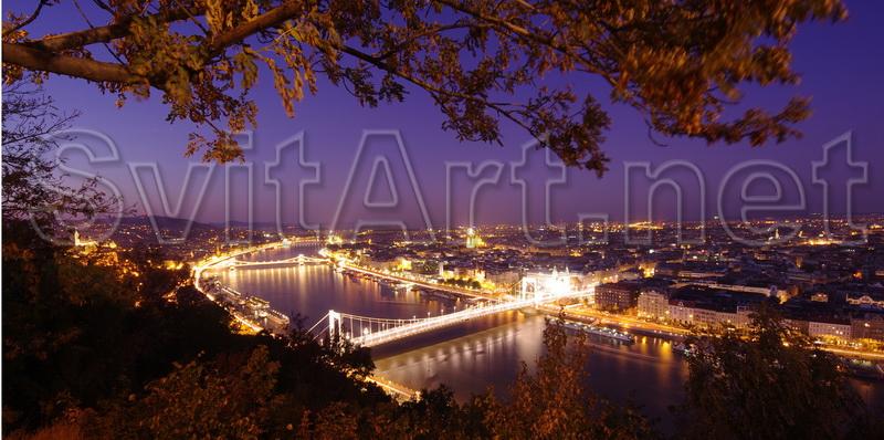 Canvas frameless "Chain bridge in the distance." View from afar at the Chain Bridge of Budapest at night.
