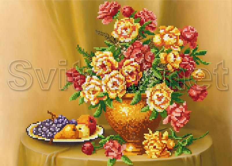 Scheme for embroidery with beads on gabardine and satin: Smelling roses on a round table, bouquet of roses, a vase full of flowers. Flowers - bouquet of roses