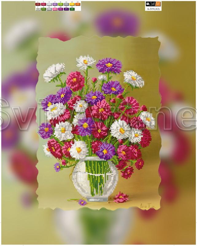Magnet for embroidery with beads on canvas "Multicolored carnations". White, red and purple flowers in large quantities in a transparent vase.
