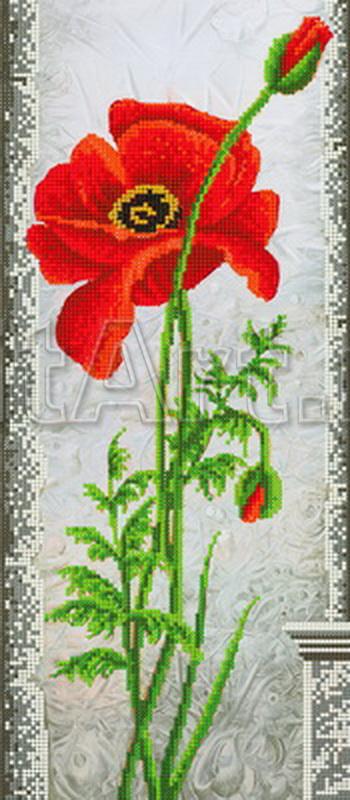 Scheme for embroidery with beads on gabardine and satin: Red poppy with buds, blooming poppy on a gray background. Flowers - red poppy with buds blossoming