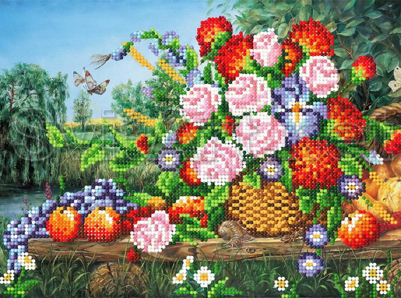 Schemes for embroidery with beads on gabardine and satin, Basket of flowers and fruit, apples of pears, flowers, grapes