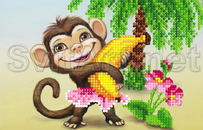 A scheme for embroidery with beads on gabardine and an atlas "Monkey with a banana". Funny monkey in a skirt with a banana in the hands near the palm tree.