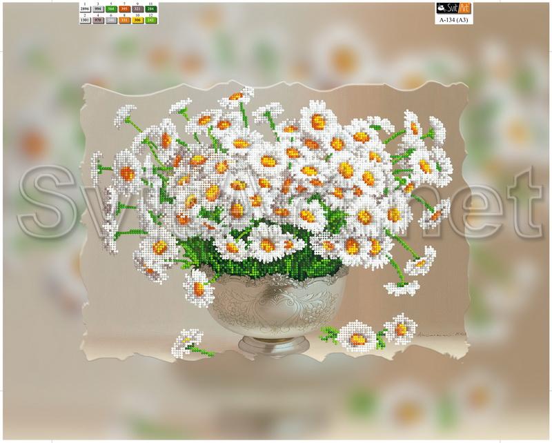 Magnet for embroidery with beads on canvas "Vase with daisies". A huge vase with a lot of chamomiles.