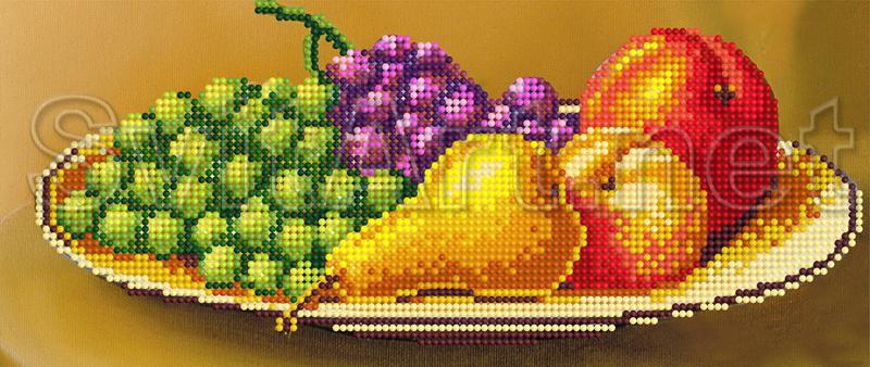 Scheme for embroidery with beads on gabardine and satin: Ripe fruit on a plate, fruit morning breakfast, gifts of autumn. Still life - fruit on a plate