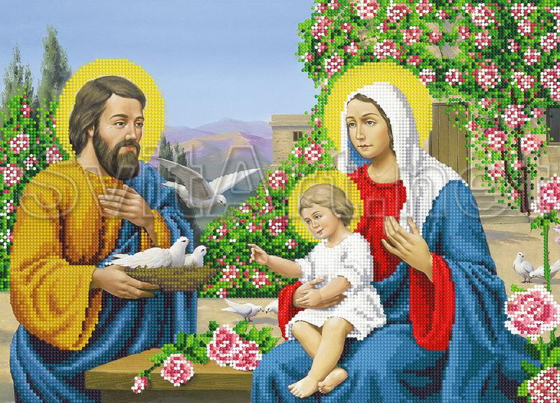 Scheme for embroidery with beads on gabardine and satin: Joseph gives pigeons to Jesus, Jesus on Mary's lap takes a pigeon to Joseph. Religion - Joseph, Mary and Jesus