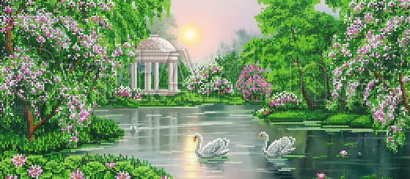 Scheme for embroidery with beads on gabardine and satin: Quiet swans on the lake, three swans in nature. Landscapes - Three serene swans on the lake