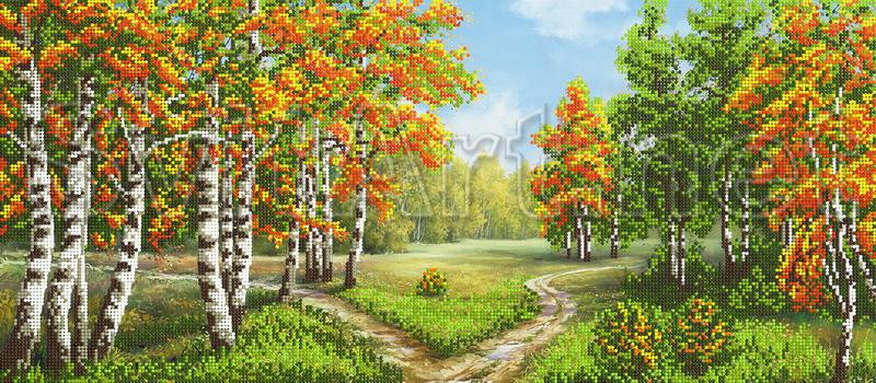 The scheme for embroidery with beads on gabardine and satin: A quiet autumn forest, a birch forest, a path in a light forest. Landscapes - Quiet birch forest