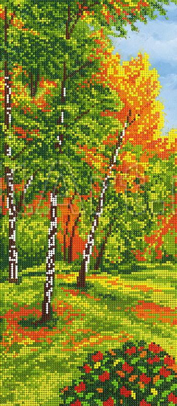 The scheme for embroidery with beads on gabardine and satin: A bush of flowers in a birch forest, a birch forest, an autumn in the forest, a bush of flowers. Flowers