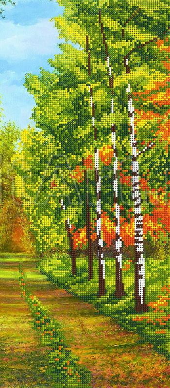 Scheme for embroidery with beads on gabardine and satin: The road to the birch forest, nature, green birches, calm forest. Landscape - road to the forest