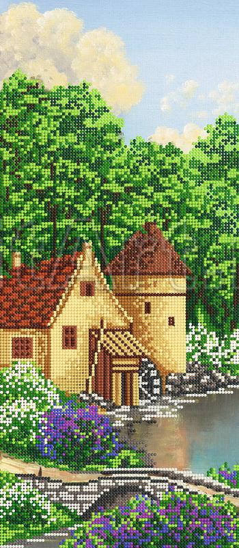 Scheme for embroidery with beads on gabardine and satin: Watermill by the lake, bridge by the lake, beautiful mill. Landscapes - a mill by the lake