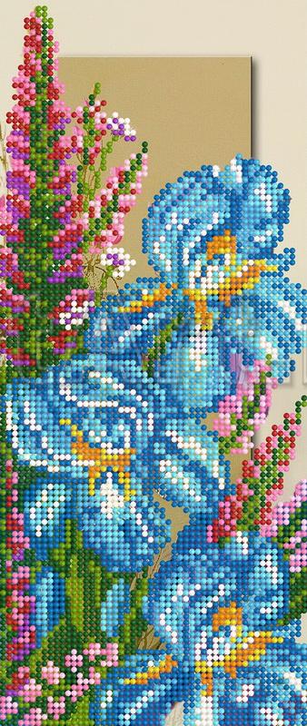 The scheme for embroidery with beads on gabardine and satin: Iris is the color of the sky, a bouquet of irises, three graceful toffee. Flowers - graceful toffee