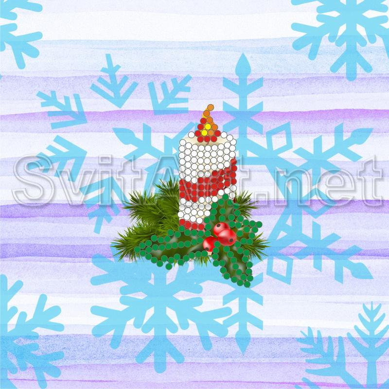 Magnet for embroidering with beads on canvas "Candle with a spruce on the background of snowflakes". Festive composition.