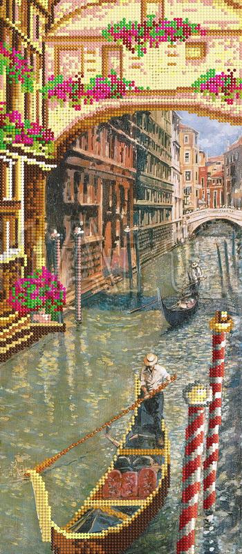 Schemes for embroidery with beads on gabardine and satin, Houses and gondolas in Venice, boat near the pier, Venetian life, bridges