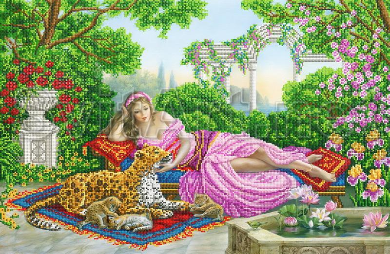 Scheme for embroidery "The girl and the leopard in the garden." A girl in a pink light robe lies in a flowering garden near the fountain and next to her a leopard.