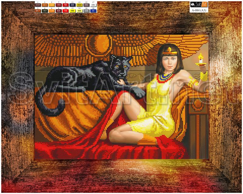 Magnet for embroidery with beads on canvas "Egyptian and Panther". An Egyptian girl in a light yellow dress is sitting next to a panther on the sofa at the painted wall.