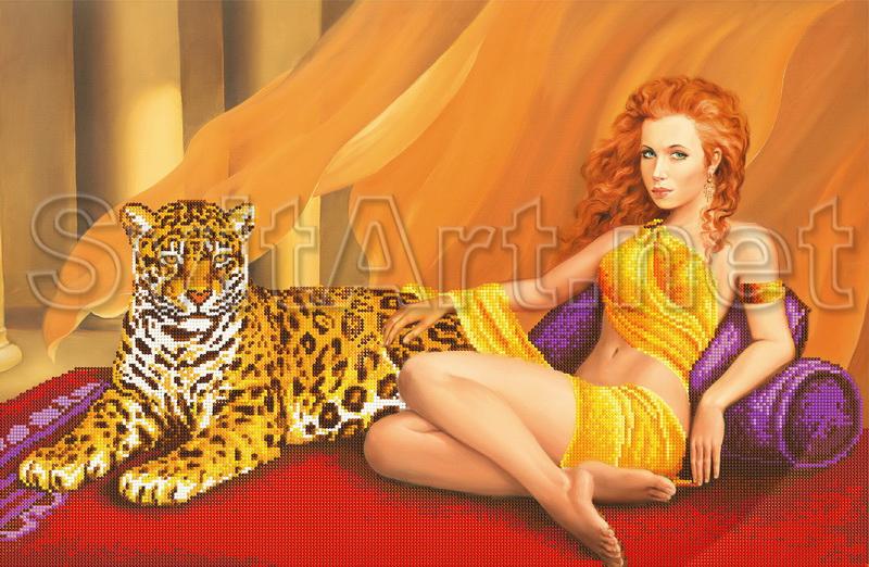 The scheme for embroidery with beads on gabardine A2 (38x58) "The girl and the leopard". The girl sits on a pillow with a large leopard leaning on the ottomans, just behind her develop curtains from the wind.