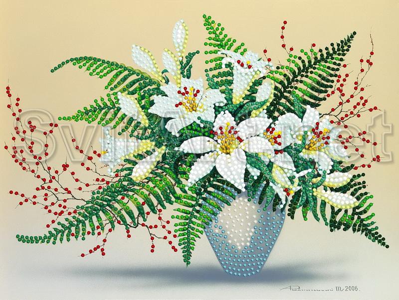 Scheme for embroidery with beads on gabardine and satin: A bouquet of white spring flowers with ferns, white flowers with ferns in a vase. Flowers - white flowers in a vase