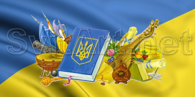 Canvas Frameless "Composition of Ukrainian Flowers." The flag of Ukraine, a book with a coat of arms, folk musical instruments and flowers.