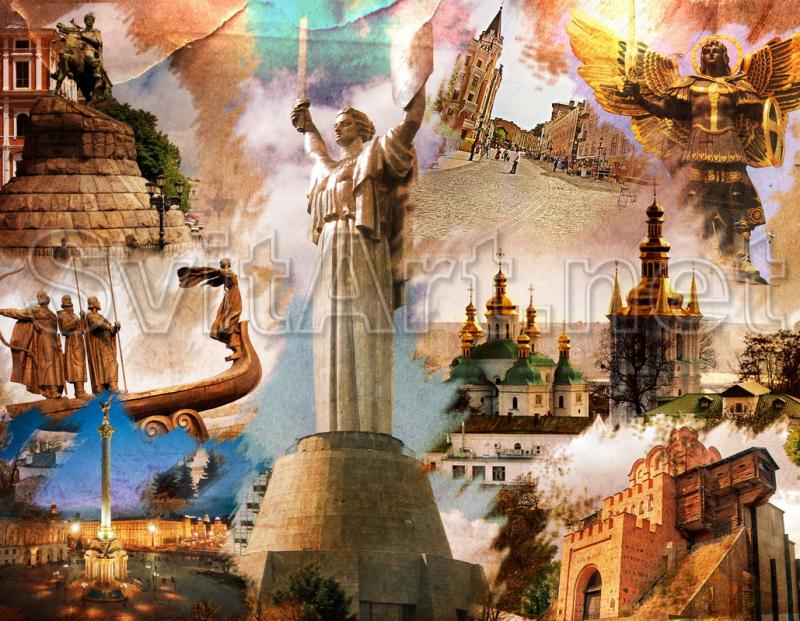 Canvas frameless "Symbols of Kiev". Arch of Friendship of Nations, a statue to the founders, a statue of Bogdan Khmelnitsky, a stele of independence, the Kiev-Pechersk Lavra and others.