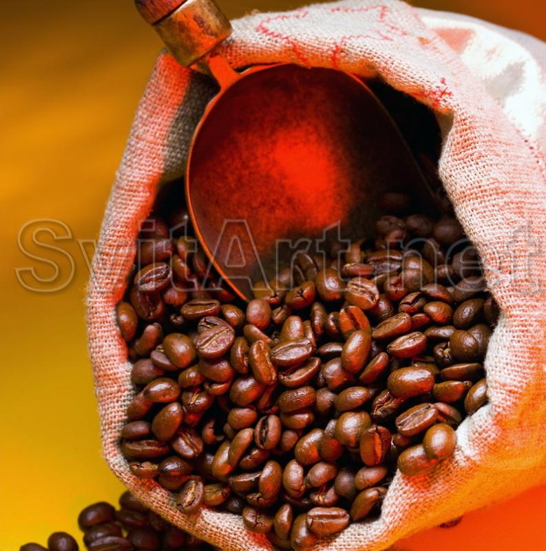 Canvas frameless "Shoulder in a bag of coffee." The spatula is inserted in a bag with coffee beans.