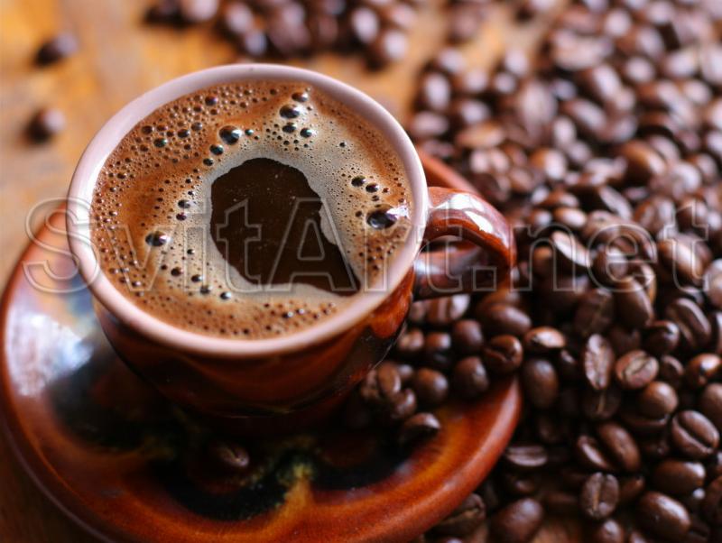 Canvas frameless "A cup of ready-made coffee and grains." A scattering of coffee beans on the table next to a cup of ready-made coffee drink on a saucer.