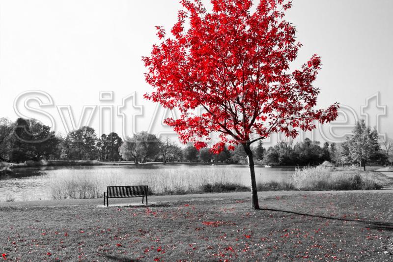 Canvas frameless "Mahogany and gray tones". Blossoming mahogany at the path with a shop, all around in gray tones.