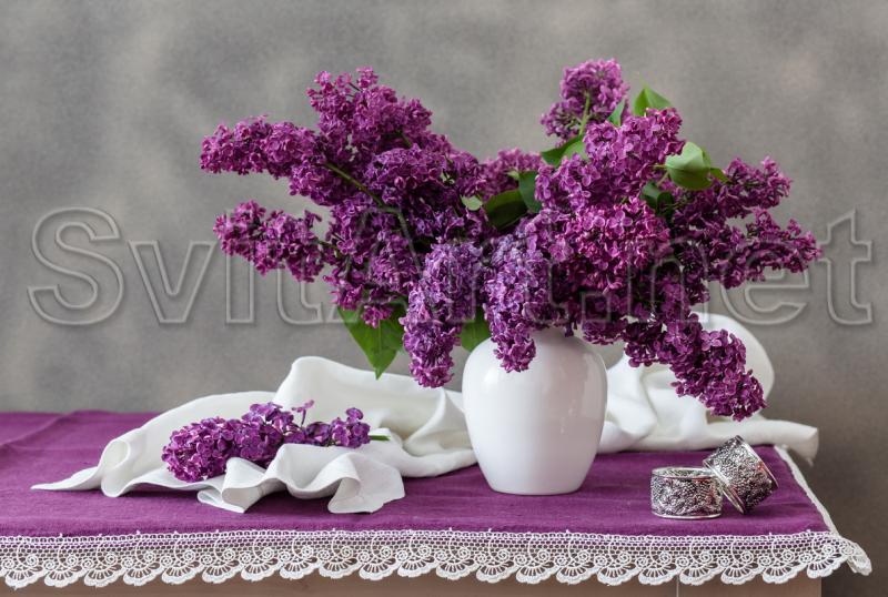Canvas frameless "White vase with lilac". Branches of lilac flowers in a vase on a table with a lilac-colored tablecloth.