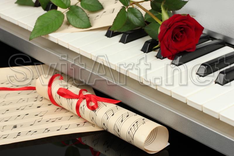 Canvas Frameless "Rose and Piano". A gentle rose on the keys and sheet music with a red ribbon beside.