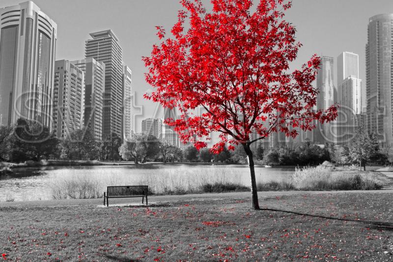 Canvas frameless "Mahogany on the background of a gray city." The tree at the bench with red leaves, everything else in gray tones.