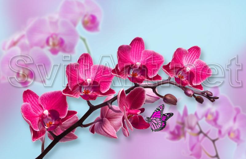 Canvas frameless "A branch of a red and pink orchid". Delicate flowers of red and pink on a blue background. A purple butterfly sits on the flowers.