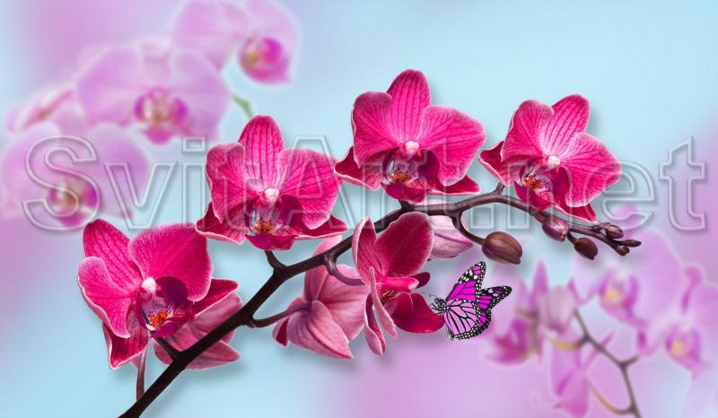 Canvas frameless "A branch of a red and pink orchid - 2". Delicate flowers of red and pink on a blue background. A purple butterfly sits on the flowers.