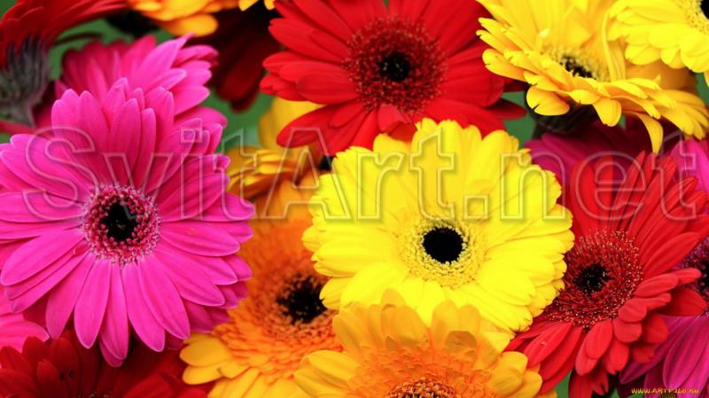 canvas, flowers, bouquet of multicolored gerberas, red, yellow, pink gerberas