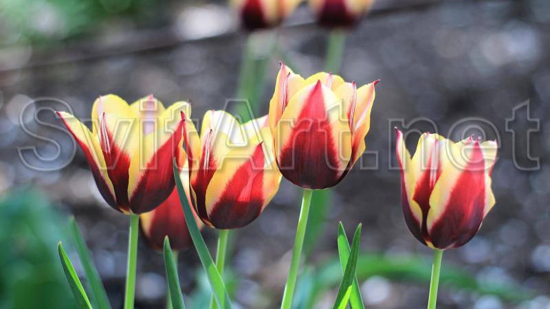 canvas, flowers, yellow tulips with red petals, colorful tulips, flowers in a flower bed