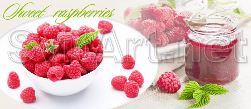 Canvas frameless "Raspberry dish and jar with jam." A crowded plate of appetizing raspberry berries and a nearby jar of juicy jam.