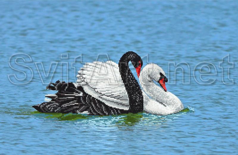 Scheme for embroidery with beads on gabardine A2 (38x58) "A pair of swans". White and black swans in the water.