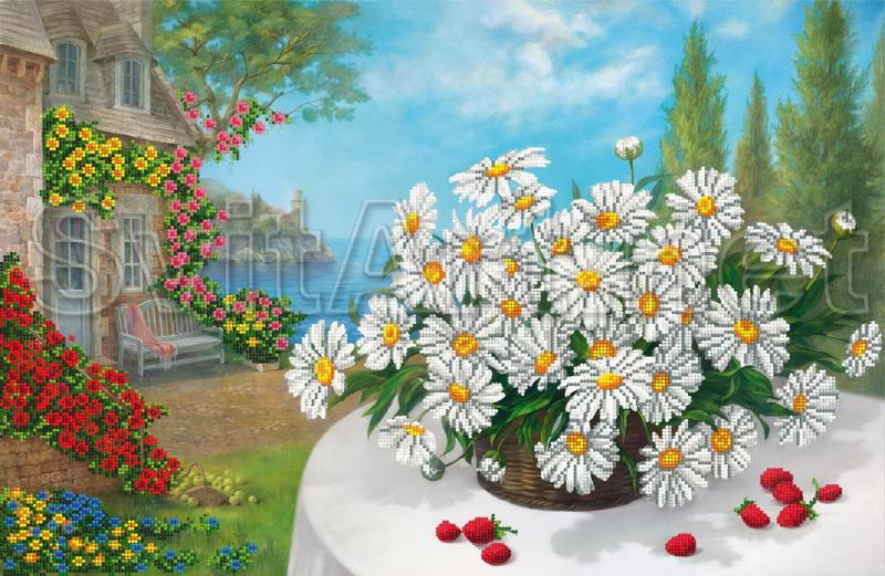 The scheme for embroidery "Chamomile in the basket in the yard." A bouquet of chamomiles in a basket on the table in front of the house against the background of the sky and trees.