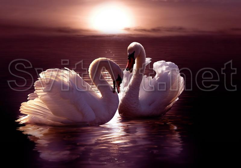 Canvas două lebede pe lebedele de apă la apus de soare, păsări și apus de soare pe apă