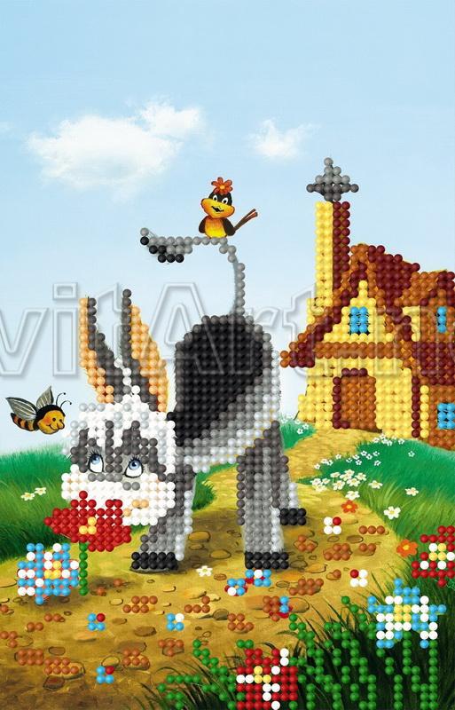 Schemă pentru broderie cu margele pe gabardină și satin "Taur cartoon". Un taur miroase o floare pe drumul din fața casei.