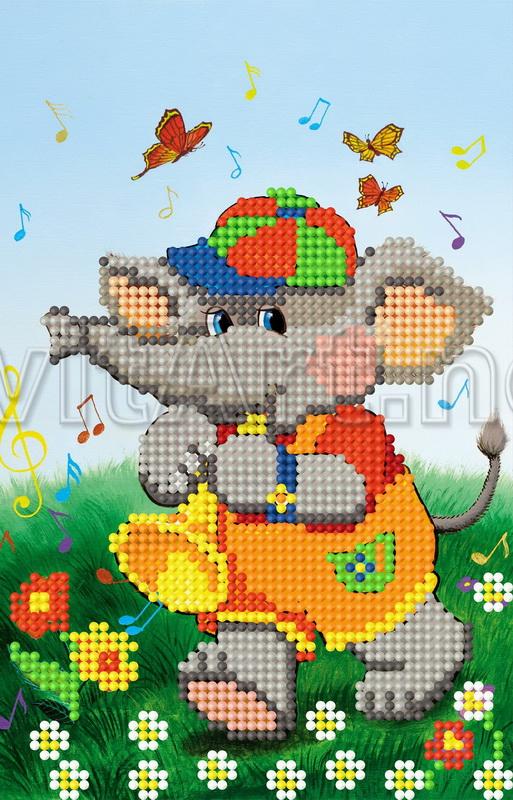 Informaţii suplimentare: Schemă pentru broderie cu margele pe gabardină și satin "Elefantul se joacă pe trâmbiță". Un elefant de desene animate într-un capac colorat trece printr-o curățare cu flori și se joacă pe o trompetă.
