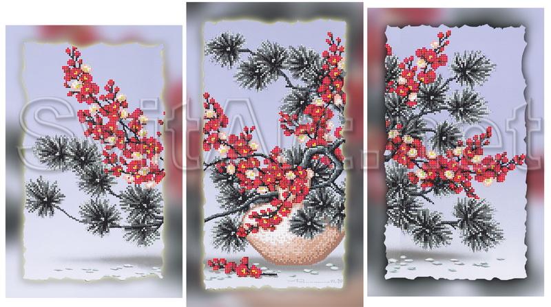 Informaţii suplimentare: Magnet pentru broderie cu margele pe triptych modular de panza "Flori si ace rosii". O vază rotundă albă, cu ramuri lungi de culoare roșie și ramuri de copac conifer.