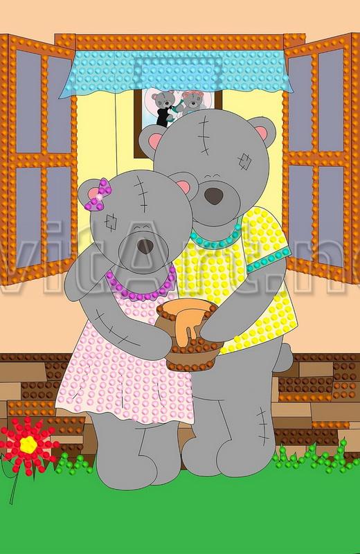 Informaţii suplimentare: Schemă pentru broderie cu margele pe gabardină și satin "O pereche de urși la fereastră". Doi urși de carton de pluș stau pe o bancă lângă fereastră, într-o îmbrățișare cu un vas de miere.